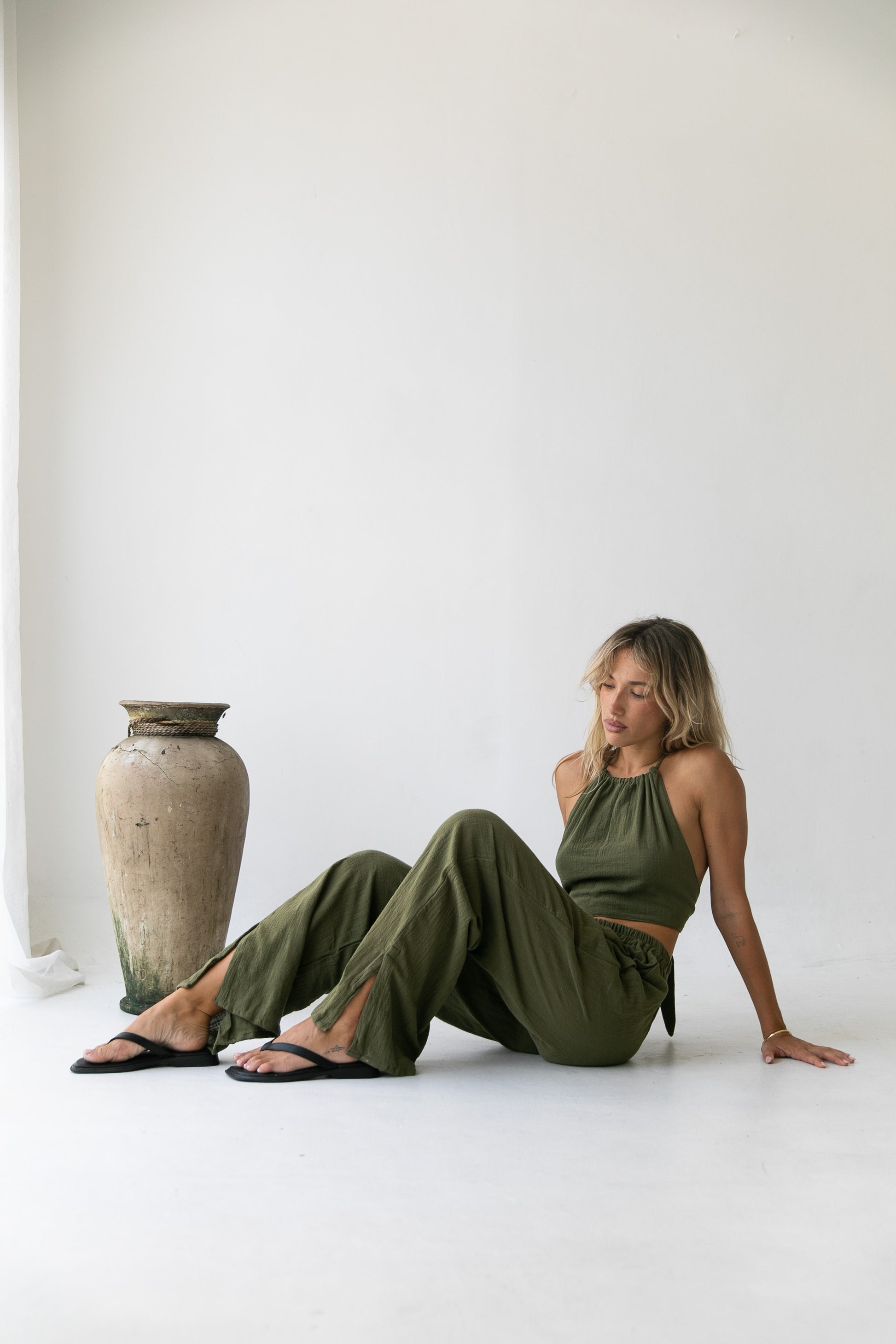 The Cara collection features a wide-legged, long pair of pants with a stylish slit. Made from the softest organic cotton, and soft elastic waste, it offers unmatched comfort. Perfect for nights out, dinner with friends, or any occasion, it remains one of your most comfortable and flattering choices. Elevate your look with this versatile and sophisticated set that embodies the essence of Akura. Hand-crafted and produced in small batches, as always.